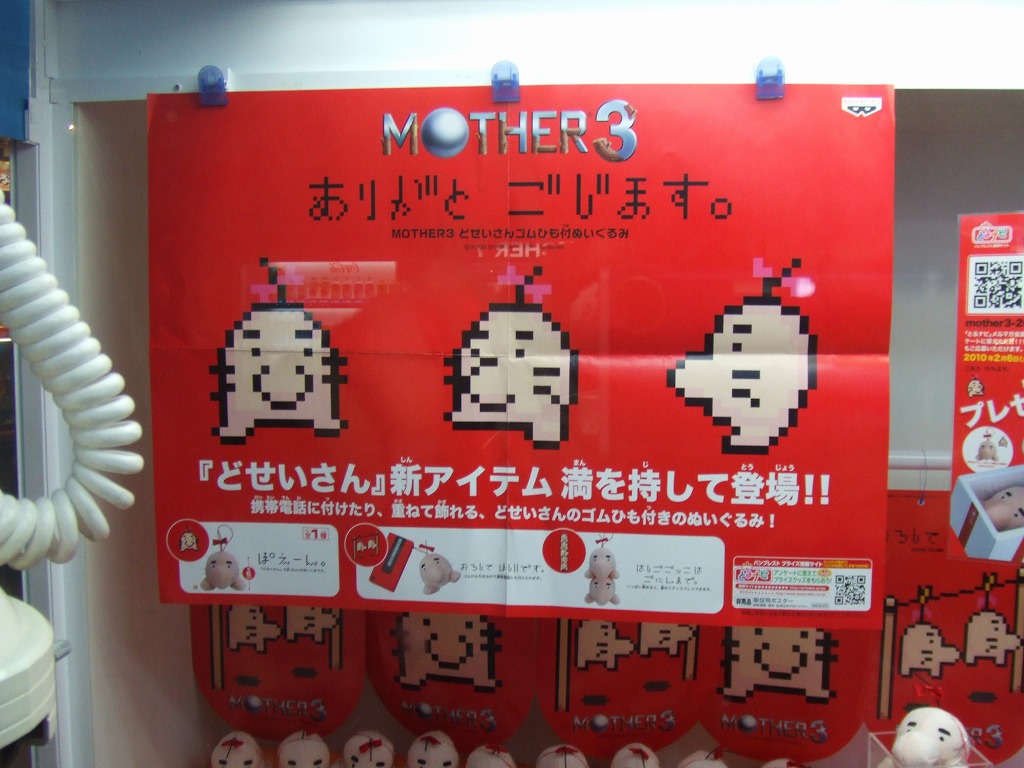 そのゲーム(MOTHER2,3)に登場する、これまた独特のキャラクター、どせいさんのぬいぐるみが、ゲーセンにおいてあったのです。